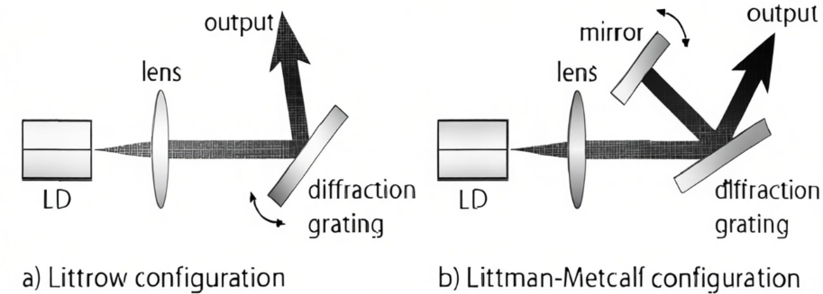 Ang mga short-cavity main-cavity laser gaya ng DFB at DBR ay may limitadong intra-cavity photon na oras ng interaksyon, na nagpapahirap sa malalim na linewidth compression. Upang higit pang i-compress ang linewidth at sugpuin ang ingay, ang ganitong mga short-cavity main-cavity configuration ay kadalasang pinagsama sa mga external-cavity na istruktura para sa pag-optimize ng performance. Kasama sa mga karaniwang panlabas na-cavity na istruktura ang mga spatial na panlabas na cavity, fiber external cavity, at waveguide na panlabas na cavity. Bago ang pagbuo ng mga fiber-optic na aparato at mga istraktura ng waveguide, ang mga panlabas na lukab ay higit na binubuo ng mga spatial na optika na sinamahan ng mga discrete optical na bahagi. Kabilang sa mga ito, pangunahing ginagamit ng mga istruktura ng feedback ng spatial external-cavity na nakabatay sa grating ang mga disenyo ng Littrow at Littman, na karaniwang binubuo ng isang laser gain cavity, mga coupling lens, at isang diffraction grating. Ang grating, bilang elemento ng feedback, ay nagbibigay-daan sa pag-tune ng wavelength, pagpili ng mode, at linewidth compression.