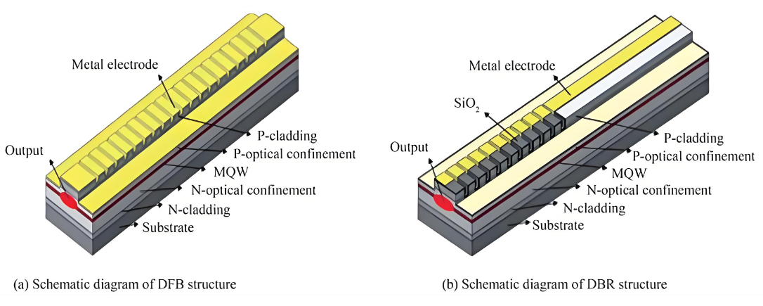 Ang teknikal na hamon ng DFB lasers ay nakasalalay sa paggawa ng mga istruktura ng rehas na bakal. Mayroong dalawang pangunahing pamamaraan para sa paggawa ng rehas na bakal sa DBR semiconductor laser: pangalawang epitaxy at pang-ukit sa ibabaw. Gumagamit ang regrown grating feedback (RGF)-DFB semiconductor lasers ng pangalawang epitaxy at photolithography upang palaguin ang isang set ng mababang-refractive-index grating sa aktibong rehiyon. Ang pamamaraang ito ay nagpapanatili ng aktibong istraktura ng layer na may mababang pagkawala, na nagpapadali sa paggawa ng mga high-Q resonator. Surface grating (SG)-DFB semiconductor lasers ay direktang nagsasangkot ng pag-ukit ng grating layer sa ibabaw ng aktibong rehiyon. Ang diskarte na ito ay mas kumplikado, na nangangailangan ng tumpak na pagsasaayos ayon sa aktibong materyal ng rehiyon at mga doping ions, at nagpapakita ng mas mataas na pagkawala, ngunit nag-aalok ng mas malakas na optical confinement at mas mataas na mode suppression capability.